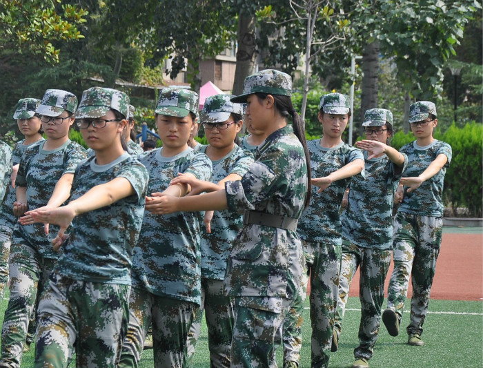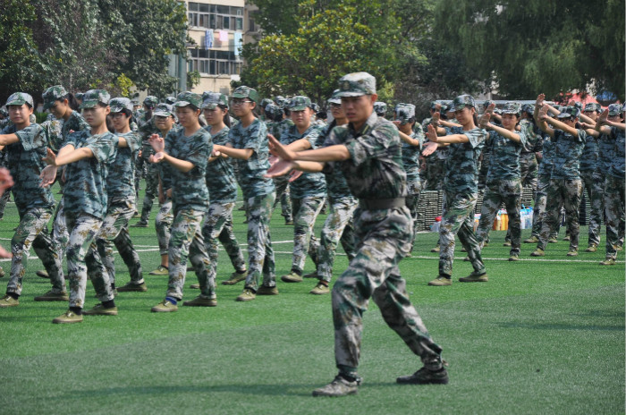自军训正式开始以来,经过反复的练习新生们已对着装、立正、敬礼、收放马扎、齐步走、正步走、四面转法等队列基本动作驾轻就熟。今天的练习内容为军体拳,虽然烈日炙烤,新生们依然保持着标准的军体拳姿式,没有教官的命令绝不乱动。教官们也一遍遍地强调着动作要领并亲身做示范,耐心教导。坚定的眼神,笔挺的身姿,都在讲述着他们内心的坚持!
