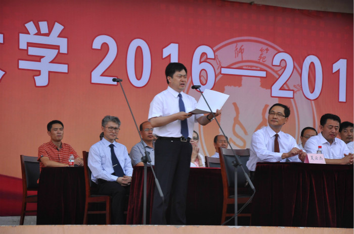 典礼在雄壮激昂的义勇军进行曲中拉开了帷幕。在庄严的国旗下,教师代表、外籍教师代表、在校生代表和新生代表分别发言,他们对新同学表示热烈欢迎,并给予新生们美好的期许和祝愿。大会最后,校长戚万学教授致辞,他首先代表全校师生员工向2016级全体新生表示热烈的欢迎。他指出,新学年同学们要做好两个准备——准备吃苦,准备经受挫折;做好两个规划——规划好四年的专业学习,规划好未来从事的职业;学会两种管理——管好时间,管好情绪;挖掘两大法宝——兴趣和专长。 他殷切地期望全体同学树立远大、正确的理想,学会把读书、思考、实践有效结合起来,加强思想品德修养,提升文明素质, 不断充实丰富自己,给自己留下一个难忘而意义非凡的大学时光。