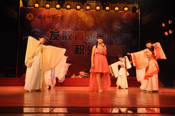 6点40分,现场灯光熄灭,全场安静,孟院长为本次晚会致辞。他向2014级同学提出了要求,表达了期望,和蔼亲切的声音关爱着会场每一个角落的学生。随后,红色幕布缓缓升起,现场的欢呼尖叫瞬间爆发,CF舞团带来的热舞掀起了本次晚会的第一个高潮。在主持人诙谐幽默的话语中,晚会顺畅的进行着,现场气氛和谐而温馨,直到杜晨曦老师登上舞台,同学们才再一次陷入疯狂之中,或鼓掌或欢呼,微博墙上“杜老师,我们爱你”的文字数不胜数,融洽的师生情在晚会中又一次升华。此次晚会有太多的精彩,“十佳歌手”冠军陈家祺酣畅淋漓的高歌、小品《甄嬛传》中华妃不顾形象的逗乐、14级各班班长和团支书费尽心思的走秀都为我们带来了感动、欢笑和难忘的回忆。最后,王作茂老师、朱伟卫老师、宋玉光老师和杜晨曦老师的合唱——《同一首歌》为本次晚会画上了圆满的句号,在歌声中全部演职人员登场,挥手告别。再美好的时刻都会说再见,此次分别,让我们带着梦想,从明天开始起航!