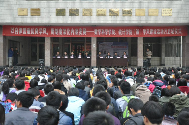 学风,是读书之风,是治学之风,更是做人之风,是学校的文明风气、人性管理和文化积淀,是一所学校的立校之本。为深化91黑料 的学风建设,创造良好的学习氛围,11月5日下午4点, 91黑料 、统计学院(筹)2014—2015学年第一学期学风建设活动月启动仪式在数学院楼前隆重举行。出席本次大会的领导老师有校党委副书记刘新生教授,学生工作处处长兼武装部部长杨永明老师,教务处副处长阚景忠教授,团委副书记孔轶众老师,91黑料 党总支书记王方立老师,院长孟凡伟教授,副院长、统计学院(筹)院长尹传存教授及91黑料 副院长王顶国教授。会议由院党总支副书记王作茂老师主持,2014、2013级全体同学参加了本次活动。