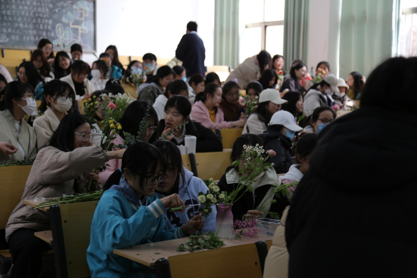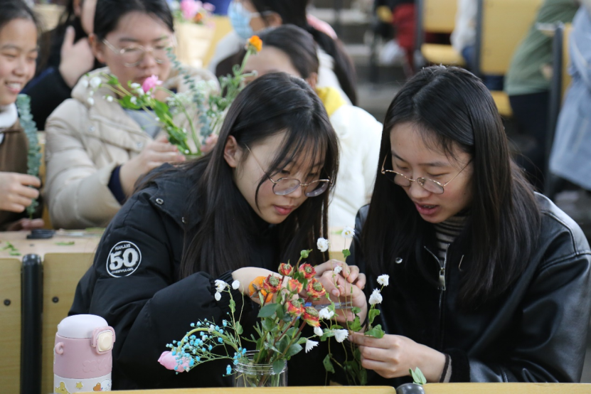 活动在轻松愉快的氛围中展开,大家首先学习了花艺的基础常识和插花的装饰技巧等知识,在场同学们分成若干小组,用自己灵巧的双手,将原本普通的多种花材进行修剪、整枝,再根据不同的色彩、形状有层次地搭配在一起。整个活动持续两个小时,活动结尾一盆盆精美的插花,带着春日气息扑面而来,增添了一抹亮丽的色彩。同学们在轻松愉悦的氛围中创造出独具匠心的插花作品,纷纷和作品合影留念。