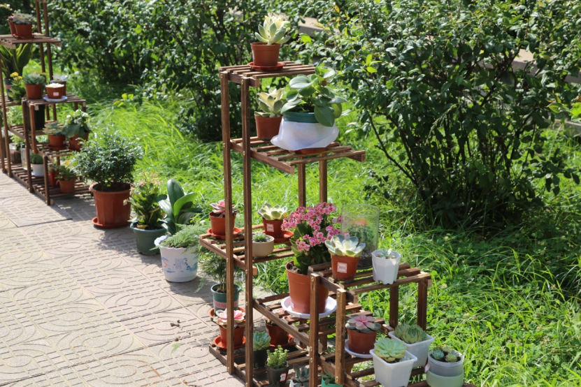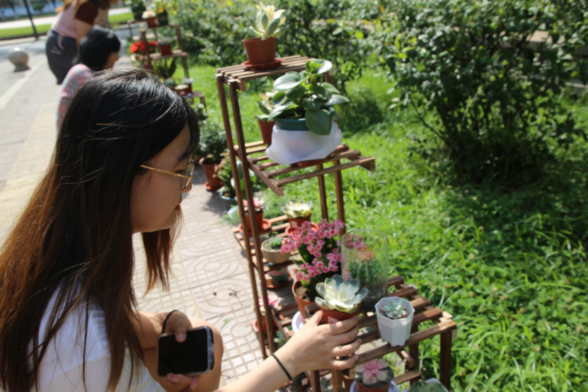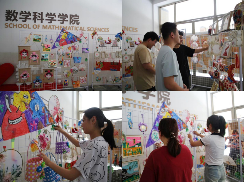 同学们自己种下植物,用心呵护,待植物长成摆放于数学楼前。各个班级依次展出自己班级的绿植,并将其摆放在花架上,排列整齐。阳光轻洒在绿叶上,叶子越发显出勃勃生机。数学楼大厅内展放出了精心制作的各式各样的手工艺品,无论是从制作还是到摆放,每一个环节显现出的都是同学们的用心。同学们纷纷驻足欣赏,体会传统艺术文化的魅力。