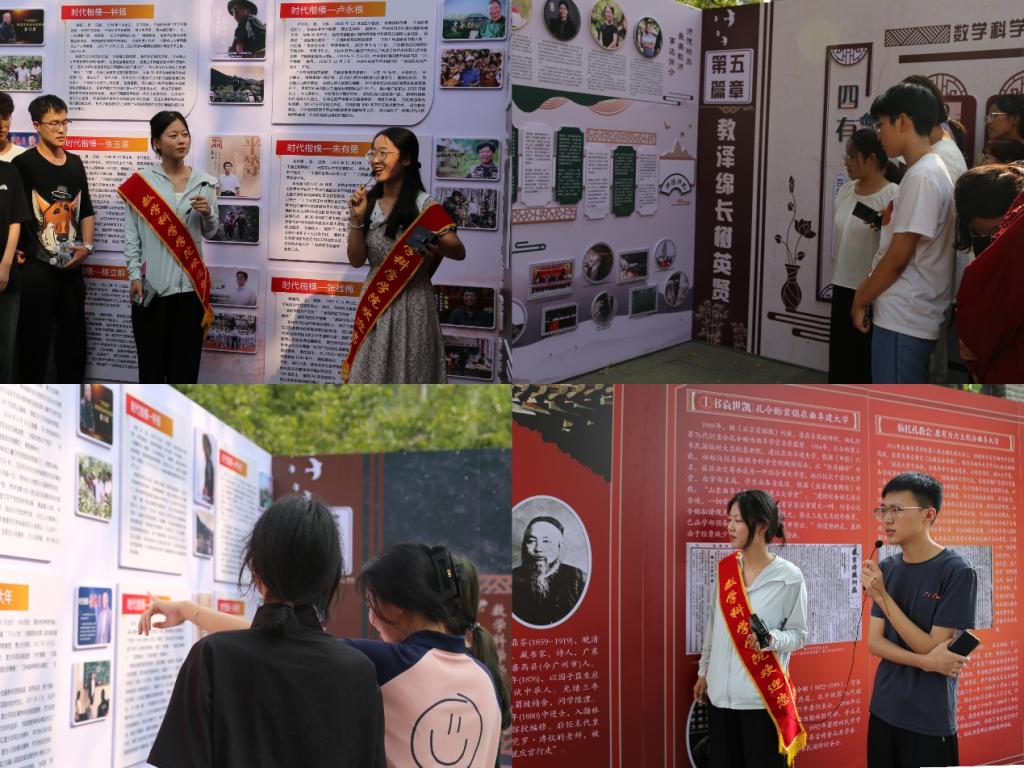 展览共分六个篇章——“木铎金声润心田”、“大国匠心扬世范”、“滋兰树蕙满庭芳”、“六秩风华传薪火”、“教泽绵长树英贤”、“春晖四方育梓梁”,每一个篇章由师哥师姐带领新生们一起参观学习,感悟习近平总书记关于教育的重要讲话,回顾曲园数学人砥砺进取的光辉事迹。师哥师姐们并向新生分享自己的心得与学习经验,鼓励新生们不忘来时初心,奋发努力学习。