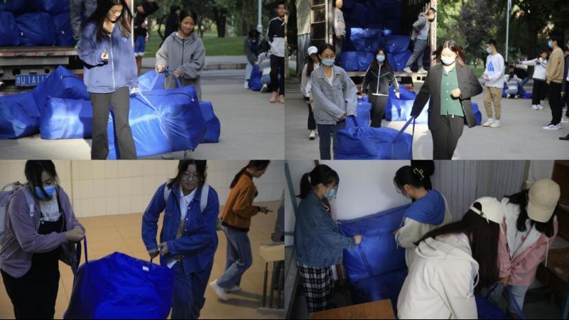 同学们在搬运分发现场互帮互助、协同合作,将被褥从货车有序地搬运分发到每一个新生宿舍。
