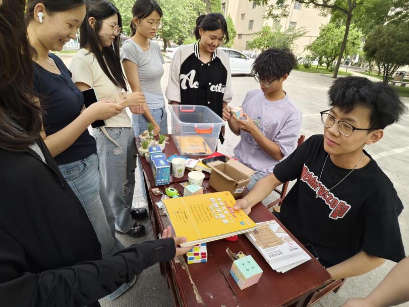 活动面向全体本科生,通过书籍捐赠、义卖筹款的方式,为教育资源匮乏地区学校筹集物资。同学们踊跃参与,纷纷捐出数学科普读物、学习笔记和文具。学院为每位捐赠者赠送绿植或小礼品,致谢爱心之举。勤工助学部志愿者对捐赠物品进行分类整理,并组织义卖。活动现场,摆满书籍和文具的摊位吸引众多师生驻足,大家通过选购物品支持公益。义卖所得善款将根据受助学校需求,精准采购数学科普读物和学习用品,确保每一份爱心落到实处。