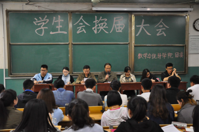 教学楼101教室顺利召开了2016年学生会换届大会。数学与统计学院党委副书记王作茂、团委书记刘永礼、辅导员朱伟卫和杜晨曦出席了会议。本次会议由刘永礼主持,参加会议的主要有2013级、2014级学生会干部成员和2013、2014、2015级各班班长和团支书。