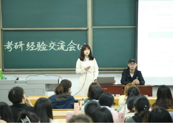 张玉婷分别从院校选择、时间规划、备考建议、考研复试四个方面给大家作了详细的分享。她强调了时间规划以及掌握自己学习节奏的重要性,并且向同学们分享了复试中的相关技巧,使同学们对复试方面的问题有了更多了解。段风霜从考研复习的基础和强化两个阶段的学习方法及教辅选择方面给大家提出建议。他强调,掌握正确的学习方法以及进行阶段总结是非常重要的。两位同学结合自身实际,给大家分享了考研备考过程中的宝贵经验,以便帮助大家找到自己最佳状态进行考研备考。