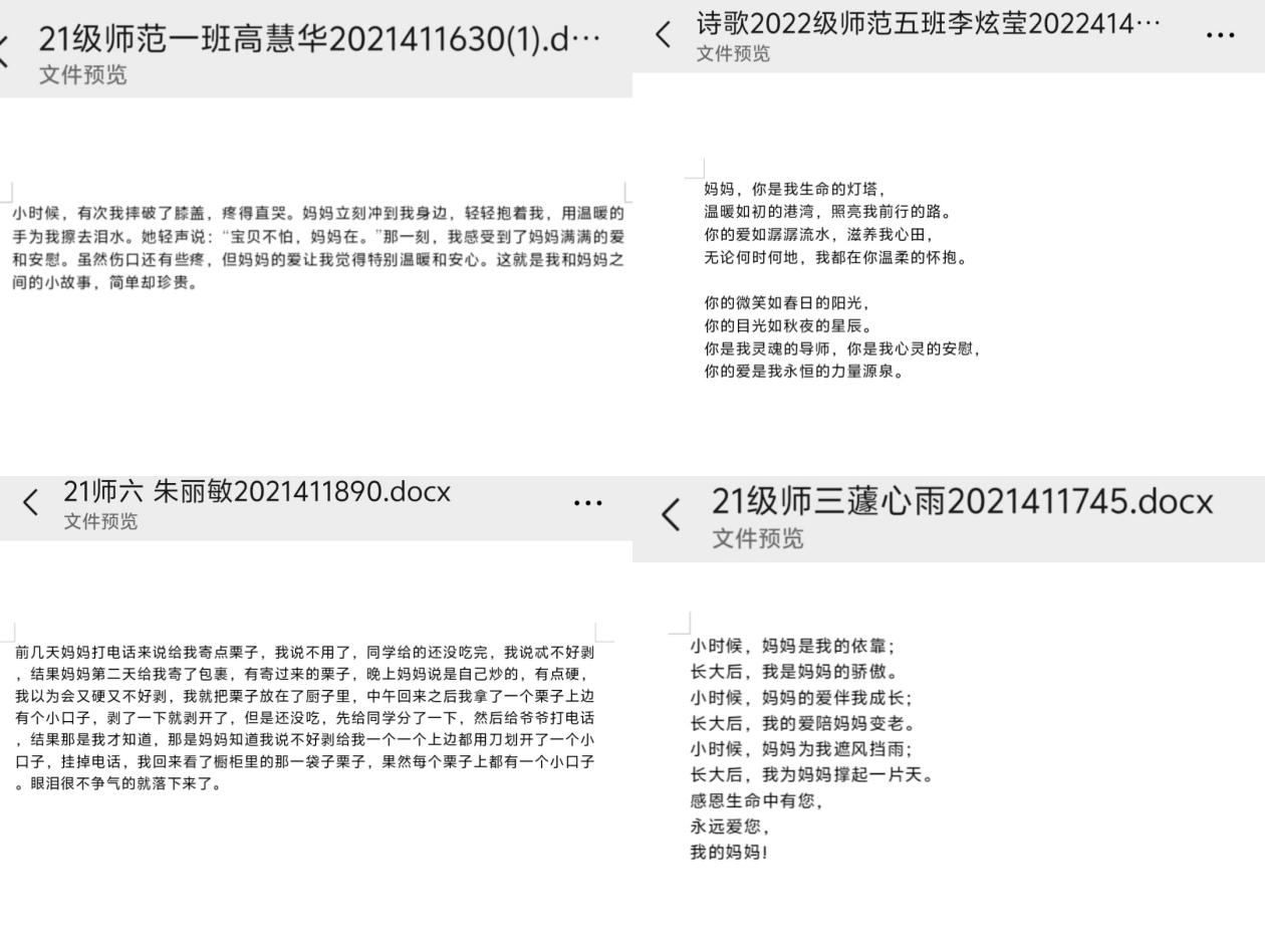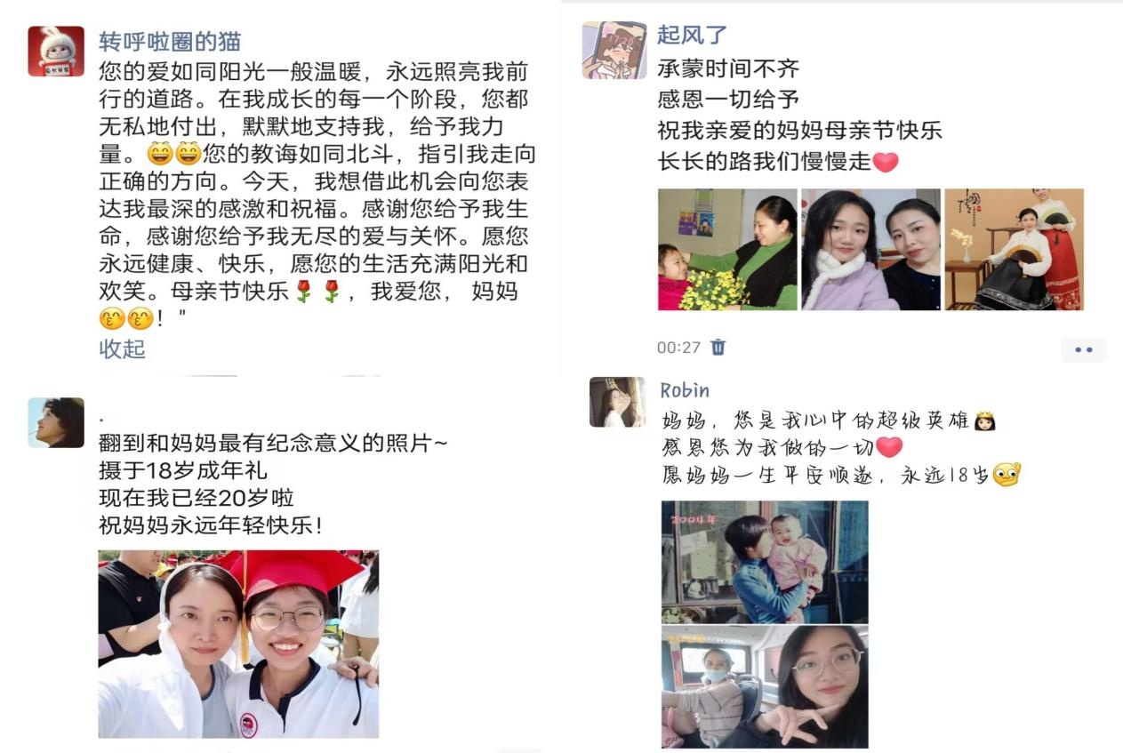 在本次活动中,同学们通过发送祝福,用文字传递了对母亲的感激,通过拍摄照片、视频,用镜头捕捉了与母亲共度的温馨时光。同学们的每一段视频、每一张照片、每一条朋友圈都表现出对母亲的浓浓爱意。