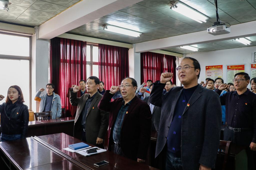 仪式上,党委书记王方立详细介绍了本次活动的活动原则、活动内容和活动方式。他指出,本次活动要坚持主题实践与提高党员素质、激励党员建功奉献相结合,坚持从党员活动方式和思想状态实际出发,加强分类指导,坚持党员率先垂范。并号召大家坚持学思践悟、知行合一,坚持全覆盖、常态化、重创新、求实效,教育引导广大师生党员“亮身份、践承诺、争先锋”,不断坚定和提高政治觉悟。在与参会党员对会议重要内容进行研讨之后,王书记总结补充,提出了加强组织领导,突出亮点特色,注重宣传引导,强化督查考核四个要求。最后,在宣誓人刘誉迪的带领下,全体党员将党徽佩戴在胸膛左上方,面向鲜艳党旗集体庄严宣誓,重温入党誓词。