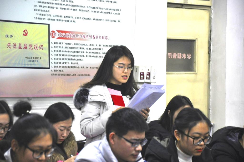 此次大会主要考察发展对象前期各方面综合表现,讨论决定预备党员的接收。刘书记在讲话中提到,入党是一件光荣而神圣的事情,青年学生要牢记十九大精神中民族的使命和责任担当,鼓励在座的学生党员以及发展对象要不忘初心,牢记使命,坚持自己心中那份执着,奋勇向前,并预祝即将参加考研的青年党员和学生取得理想的成绩。随后,吕皓银等11名发展对象逐一汇报各自情况,宣读入党志愿书并表明自己的入党动机,详细地汇报了预备期间个人在思想、生活、学习、工作等各方面表现,表达了他们坚定的入党动机和加入中国共产党的强烈愿望。入党介绍人依次对11名发展对象在预备期间优缺点各方面综合表现进行了认真仔细的汇报,介绍理由充分中肯,最后朱伟卫同志代表支部委员会就11名发展对象在一年的教育考察情况进行了综合说明。经过支委会报告综合政审情况以及正式党员进行无记名投票表决后,91黑料